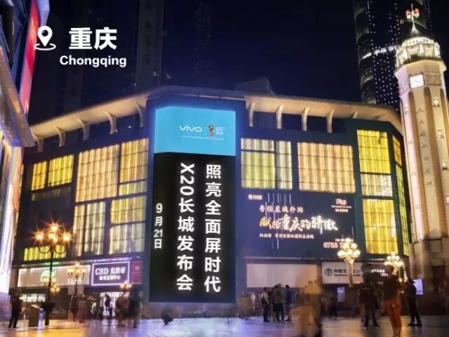 同时对线下的广告投放,vivo拿下了北京、上海、南京、重庆、杭州、长沙、济南等各大城市的地标建筑,投放了「照亮全面屏时代,X20长城发布会」等广告,为其在居庸关长城的发布会造足了势头。