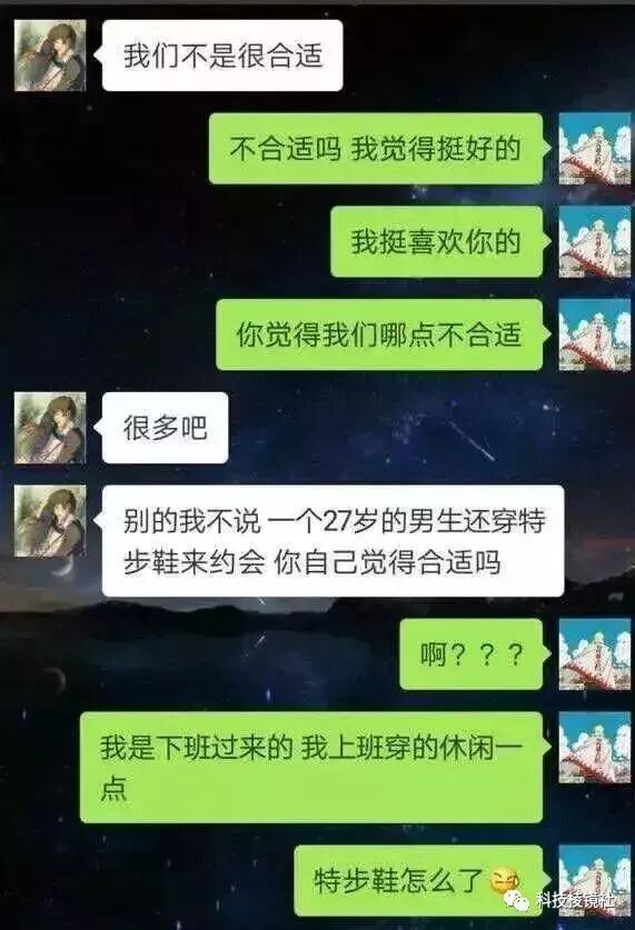 这不最近发生的一件事情再次让“程序猿”的恋爱世界成为关注的焦点,杭州萧山的一位“程序猿”与异性约会时,着装上保持了一贯的放松自我的风格。谁知却因此,遭到了对方的拒绝,而理由竟是穿运动鞋约会不够精致,“特步”只适合小学生和初中生穿。