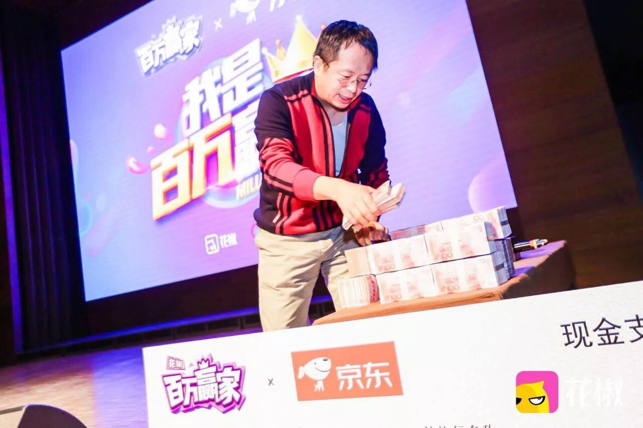 发布会开始后朋友圈便流传老周拿着一沓百元大钞,面前放着103万大支票和几大捆现金的图。不过,比起巨额奖金,这场发布会最值得关注的点在于,金主、平台方、用户同时在场,这似乎打破了过去互联网传播事件的隐秘特性,比如此前papi酱广告被拍出2200万的天价广告,罗辑思维很爽,撮合了新媒体史上的第一拍,但客户爽不爽不得而知,因为广告效果如何客户并没有反馈,甚至有人说这其实是一个2200万的局。而今天百万赢家的现场,三方都到齐了,且传播效果完全是透明的。