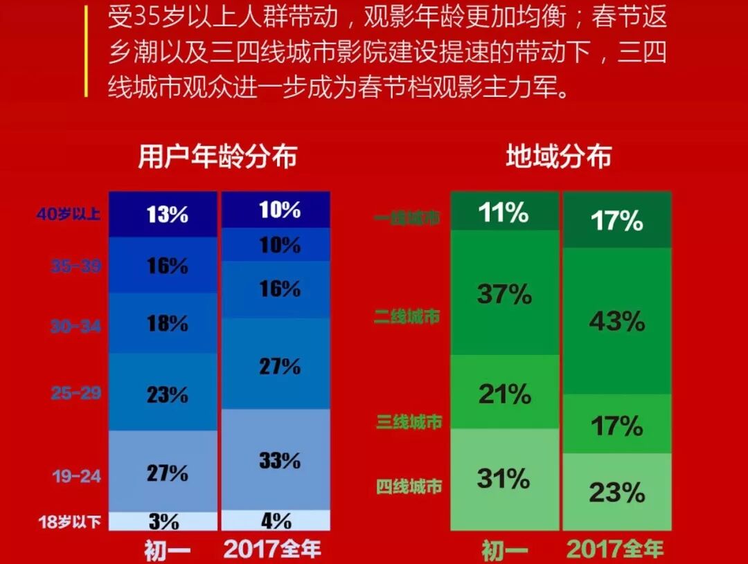 随着三、四线观影势力的崛起,“小镇青年”日渐成为影片票房大爆的巨大增量,《战狼2》、《前任3》的票房走高,该群体功不可没。尤其是在春节这个特殊档期,原本在一、二线城市的打工、求学人群也会大举回流,与三、四线群体一起成为票房贡献主力。