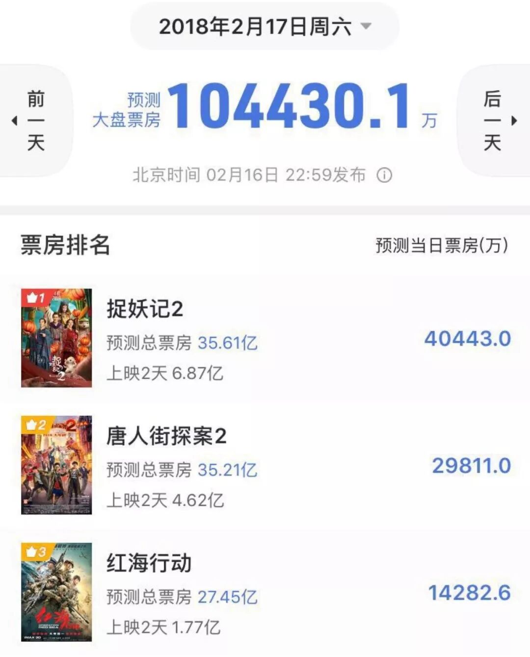 不过,值得注意的是,猫眼对《捉妖记2》《唐探2》《红海行动》的票房预测,前后都出现了不同走向的波动。2月16日晚,猫眼对三部影片的预测票房分别是35.61亿,35.21亿和27.45亿。而在2月17日晚,三者数据分别变成了28.98亿,38.63亿和32.31亿,《唐探2》和《红海》的预测票房都超越了之前预测最高的《捉妖记2》。