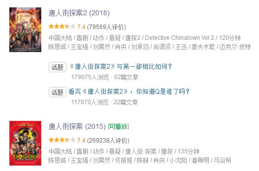 巧合的是,《唐探1》的豆瓣评分同样为7.4分,当时影片在贺岁档上映,喜剧+悬疑的题材让人眼前一亮。《唐探2》延续前作,在搞笑之余,烧脑程度更是有过之而无不及,从目前的口碑来看,陈思诚的导演才华并未让观众失望。