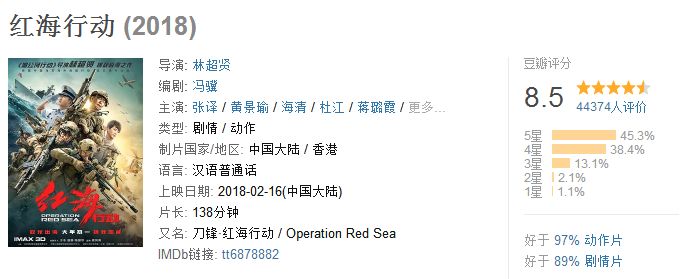 另外,《红海行动》的票房预计也将超过30亿,但目前来看,《红海行动》的排片仅是《捉妖记2》、《唐探2》的一半左右,三天票房累计超4亿。但是,《红海》的豆瓣评分高达8.5分,已超出系列前作《湄公河行动》的8分。