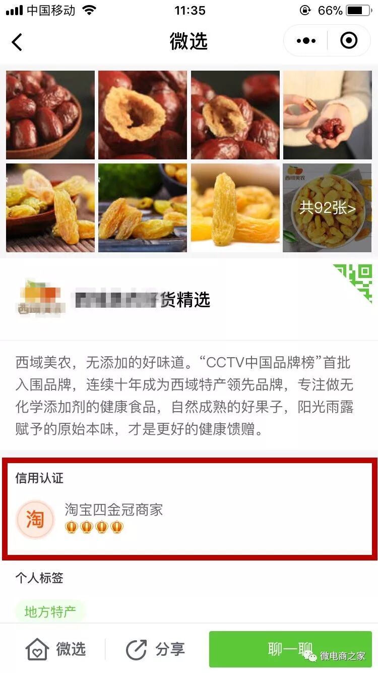 在微选的页面有,有一个比较重要的信息点。即,信用认证。