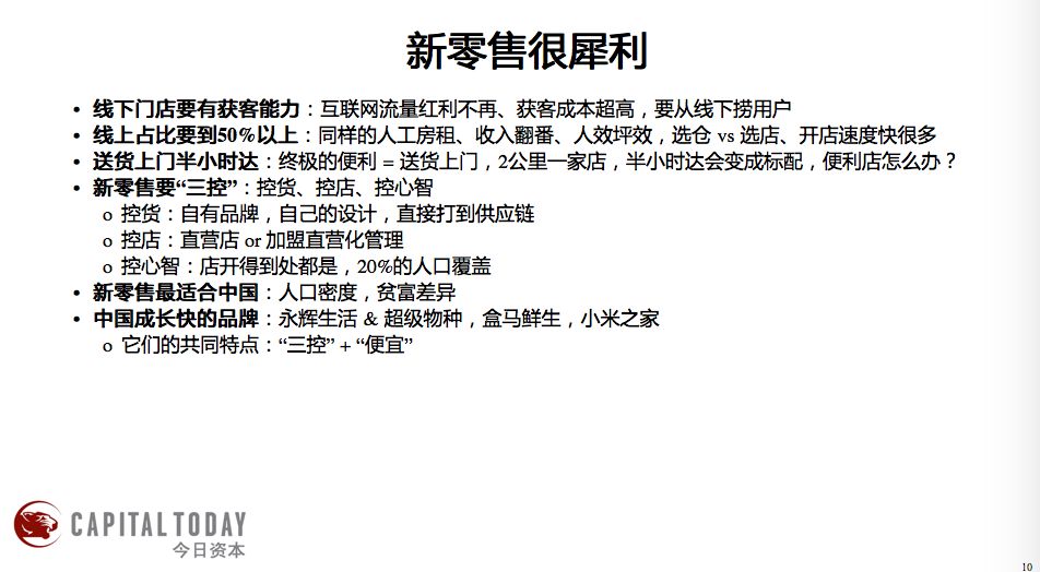 过去,消费互联时代,70%的增量被全球5家大公司(谷歌、脸书、亚马逊、腾讯、阿里巴巴)拿走,未来在新零售犀利的趋势下,如果能以像永辉超市这样每年10倍的增长速度持续渗透的话,10-15年间,新零售物种又将诞生一个10倍增长的超级平台也不再是梦。