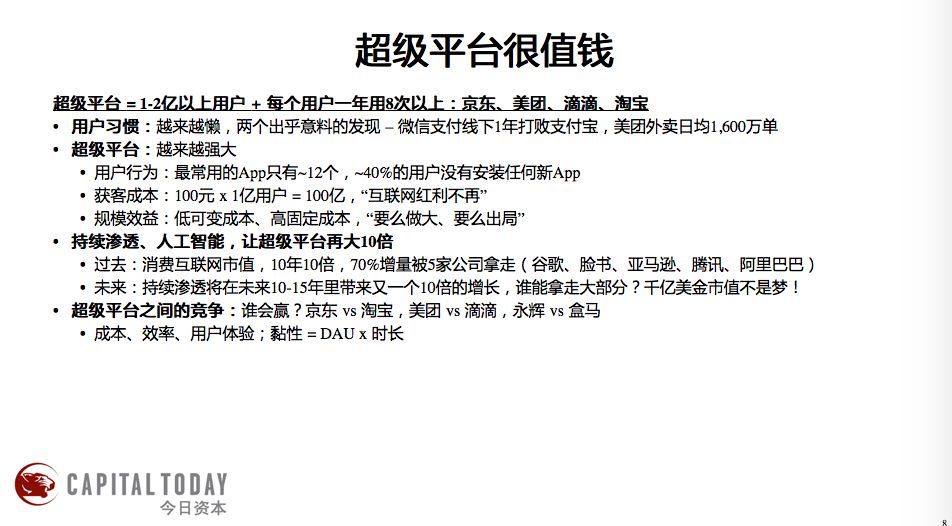 超级平台是什么?徐新是这么定义的:当你拥有1到2亿用户,且每个用户一年使用频次在8次以上,我们叫超级平台。
