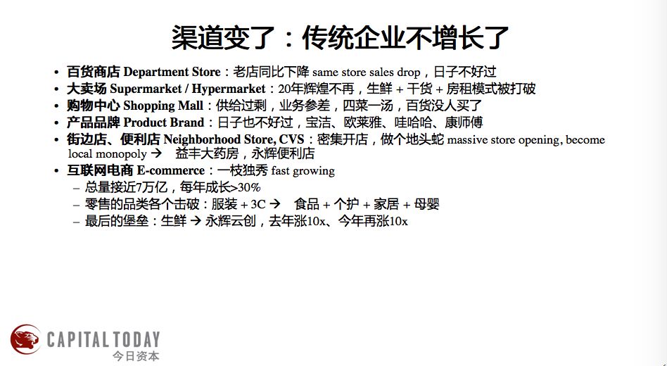 他们搭错了战船,一个品牌你能否增长很快,要看你搭上哪一个战船,大家都说中国的零售每年增长10%,但是这是个平均数,平均数是非常误导人的,你要看后面细分的市场。首先,百货商店是肯定不涨的,老店同比几乎都在下滑,当然还有沃尔玛、家乐福这样的大卖场,除了像永辉和盒马的生鲜做得好,其他基本上都在下降,徐新如是说!