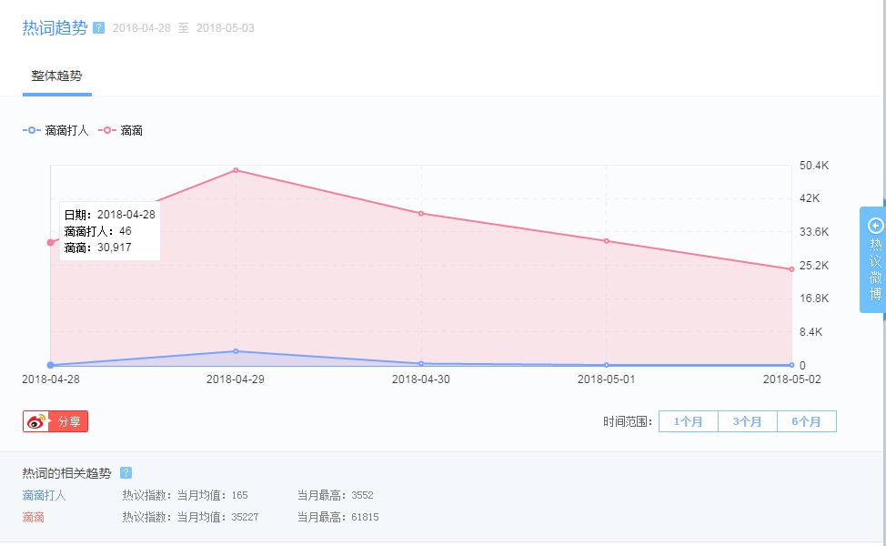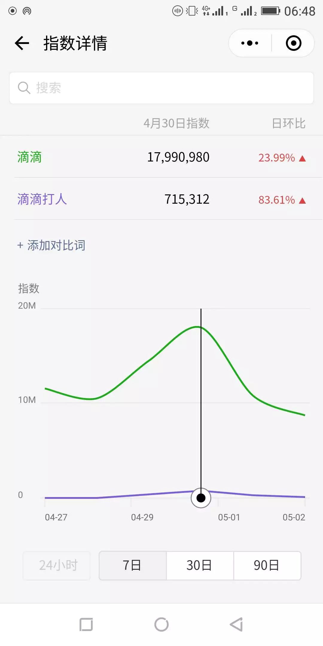 大叔通过微指数和微信指数,以“滴滴打人”和“滴滴”作为关键词进行搜索发现,从这次舆情爆发到结束,最高点出现在4月29日和30日,也就是当事人第一篇10万+的微信文章。