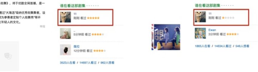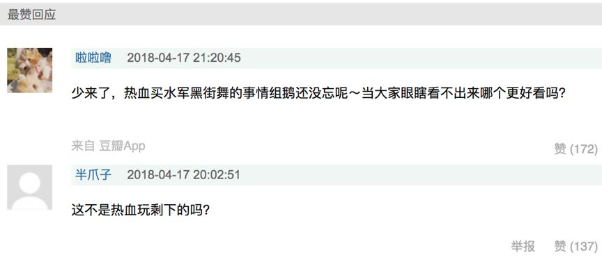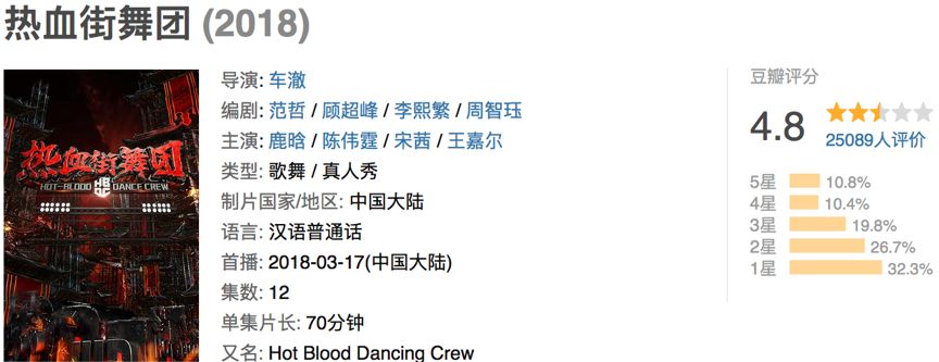 据豆瓣网友爆料,“很多给《热血街舞团》打一星的粉丝,竟然都齐刷刷的统一给所谓的‘隔壁节目’《这就是街舞》打了五星。”而且还“都是新注册的号,而且近期唯一的动作就是给《热血街舞团》和《这就是街舞》打分。”