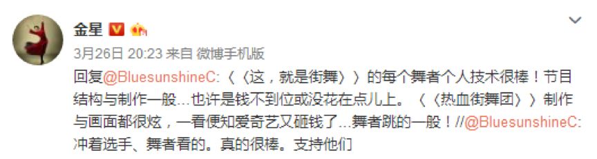 尽管街舞选手们一直喊着love&peace&respect,但是这两档街舞综艺之间却存在着暗自较劲甚至直接公开的挑衅。《这就是街舞》上线前,还特地发了微博@热血街舞团:“久等了,我们8点见@热血街舞团”,火药味十足。