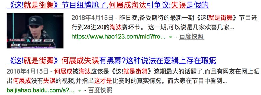 而《这就是街舞》在第八期,因为大神何展成失误遭淘汰,节目热度瞬间飙升至最高,这个事件也一度引发了“黑幕”争议。