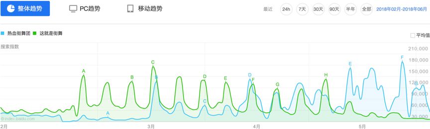 3、百度指数:《这就是街舞》自2月24日起每周六20:00在优酷首播,于5月13日收官,《热血街舞团》自3月17日在爱奇艺首播,于6月2日收官。从百度指数上来看,《这就是街舞》占据了先入为主的优势,大部分时间的热度都要高于《热血街舞团》,而《热血街舞团》仅在《这就是街舞》收官后,才在百度指数上大幅度超越《这就是街舞》。