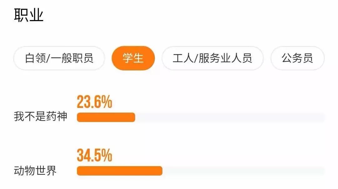 从职业分布来看,《动物世界》的观众中,学生群体占比在34.5%,而《药神》的学生群体占比仅23.6%,相对更低,占比最大的“白领/一般职员”比例为57.1%。