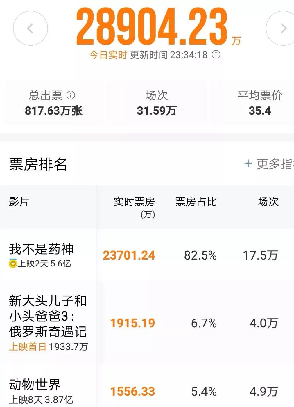 之前,《药神》点映票房过亿,公映后排片占比50%以上,票房占比更是将近80%,预计最终票房将冲击40亿,而《动物世界》预计最终票房不足5亿,前者预计是后者的8倍之多。