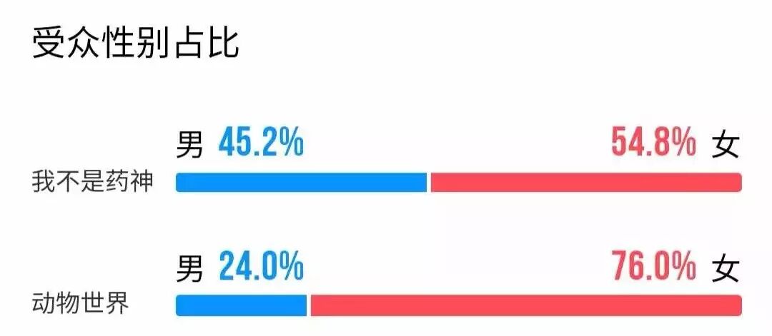 淘票票数据显示,在性别占比上,《动物世界》的女性受众占比高达76%,而《药神》的女性受众占比在54.8%,而男性占比为45.2%。