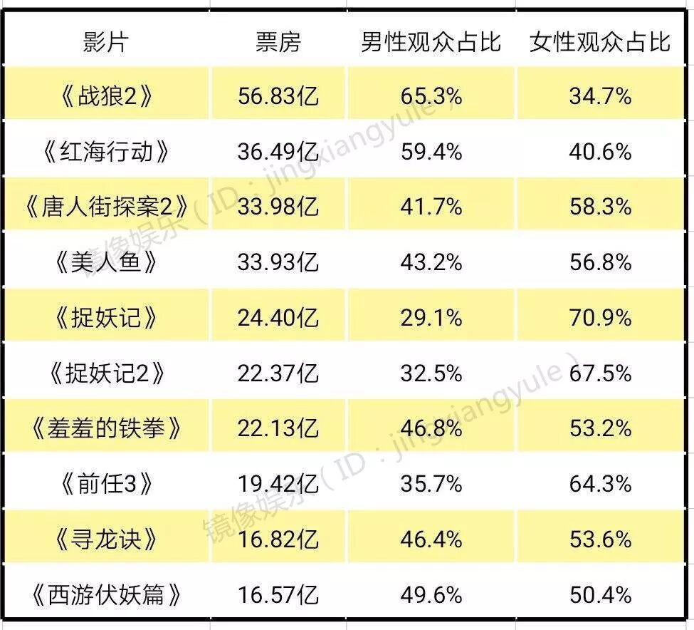 之前《小时代4》,女性受众占比75.7%,《爵迹》的女性受众占比75.2%,影版《三生三世十里桃花》的女性受众占比81.4%。“粉丝电影”的受众面一般较窄,限制了票房的进一步走高的可能性。而在保证“常规流量”的情况下,能够拉动更多男性走进影院的影片,增量受众更多,票房大爆的概率就更大。