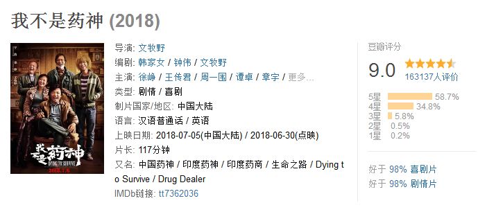《药神》对《动物世界》的碾压不仅体现在票房上,还体现在口碑上。目前,《药神》已经拿到猫眼9.7分,淘票票9.5分的成绩,连一向苛刻的豆瓣也打出了9分的高分。要知道,去年封神的作品《摔跤吧!爸爸》豆瓣9.2分。