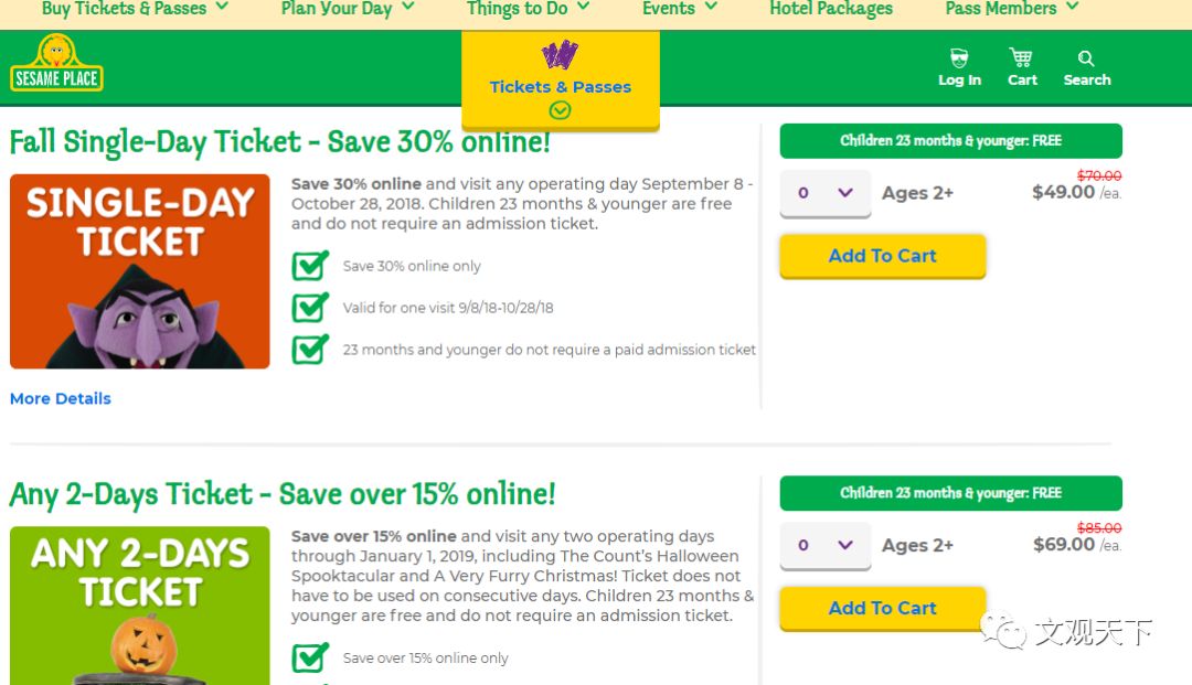 以美国芝麻街公园为例,单日的门票折扣价格为49美元,如果玩两天的价格为69美元,这样要在附近住一晚。停车一整天是20美元,午餐单人平均20美元左右,一瓶饮用水是2美元。不过最贵的是芝麻街众多卡通形象的周边产品,一个气球10美元,一件衬衫18美元,一个玩具则是21美元左右。美国加州的迪士尼乐园的门票价格为例,一天的门票受日期影响,两天的门票从105美元起。食物的价格差不多,但周边产品的价格更贵。