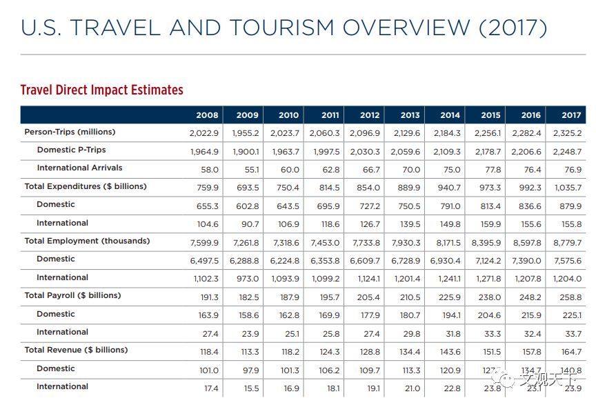 3.美国国内旅游创造了6%的非农就业,约为880万个工作岗位,同比2016年增长2.1%。与旅游业相关的岗位数为1560万,美国非农就业人数中每九个有一个与旅游业直接或间接相关。因为旅行者会产生间接消费和服务购买等,对当地产业有着广泛影响,在乘数效应下,2017年旅游业对美国经济的总贡献是2.4万亿美元,直接从业者的工资收入达到2590亿美元,联邦、州、地方政府的税收收入达到1650亿美元。