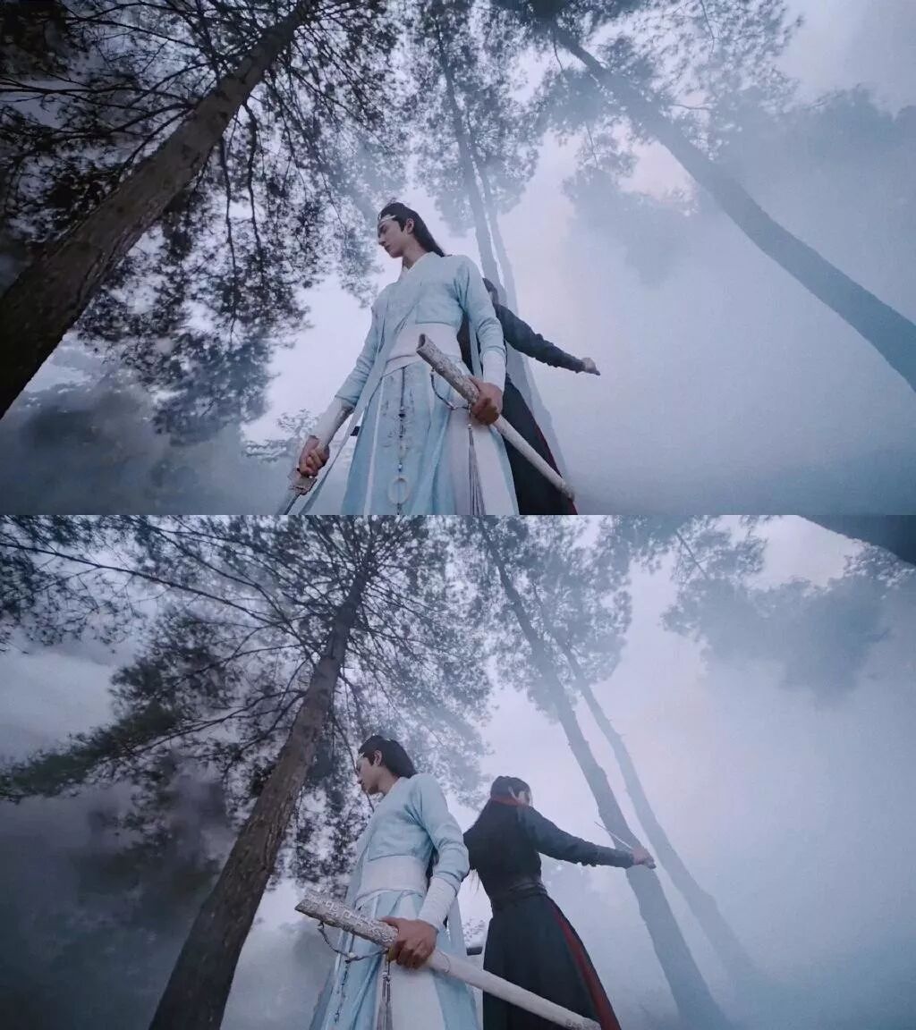 同是持剑,魏无羡单手提剑,而蓝忘机左手拿剑鞘,右手执剑指地,前者勇猛,后者沉稳,也代表了云梦江式与姑苏蓝氏的世家风貌。