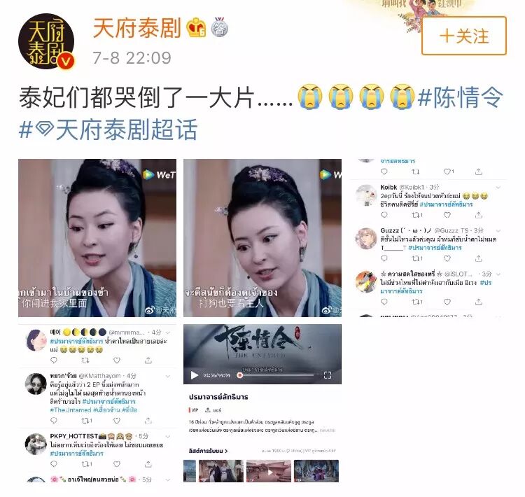 热度还持续蔓延到了海外,《陈情令》在泰国播出后“虐”倒一片。