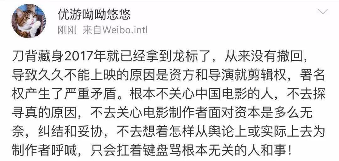 载誉归来的《刀背藏身》早在2017年就拿到了龙标,但却因为各方意见不合、制片方和导演的纠葛,种种原因,迟迟没能上映。而在这背后,也不排除有其他“技术”原因。毕竟拿了龙标,也不是就一定能顺利上映的。