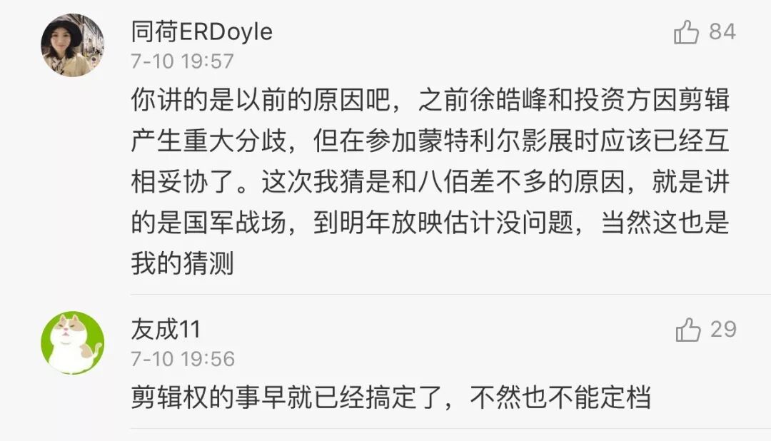 而也有网友反驳这种观点,认为剪辑权风波已过,问题还是在于影片的“敏感”内容,与《八佰》类似,都讲述了国军战场。
