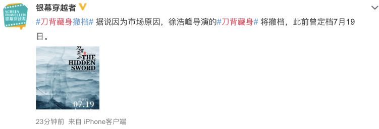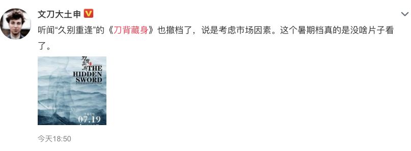 原定于7月19日上映的《刀背藏身》被曝撤档。