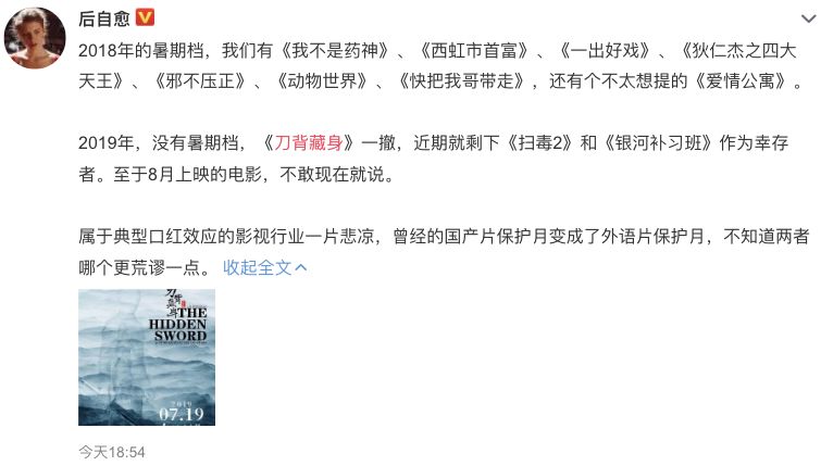 接连送走了《少年的你》《八佰》《伟大的愿望》之后,《刀背藏身》一撤,7月的暑期档只剩《扫毒2天地对决》《银河补习班》两部热门国产电影。明明处在“保护月”,但优质的国产电影屈指可数,国内影视从业人员倍受折磨,2019全年电影大盘也遭受重创。