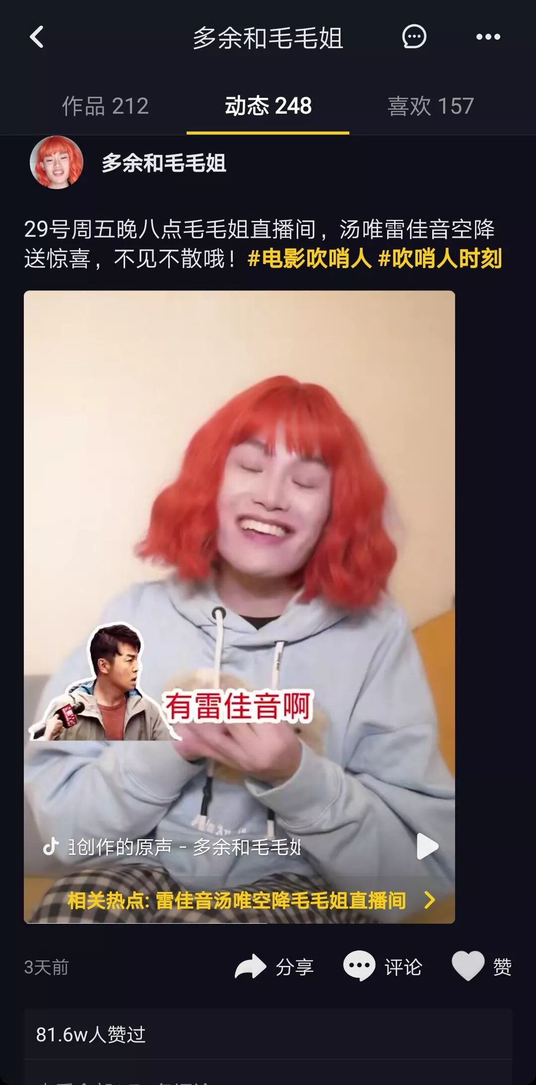 11月28日,也就是《吹哨人》直播前一天,抖音博主@多余和毛毛姐曾发布了一条带有强烈个人风格的短视频,预告汤唯、雷佳音将在11月29日空降自己的直播间。