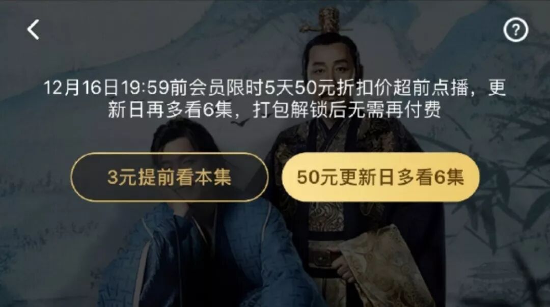 12月11日,腾讯视频和爱奇艺向已购买VIP会员的用户,推出电视剧《庆余年》“50元更新日多看6集”的付费超前点播。据了解,这不是首部采取付费超前点播的影视作品,包括《陈情令》、《没有秘密的你》、《从前有座灵剑山》等影视剧都曾使用这一加更方式。对此,部分观众为了看到更多剧集而充值,但也有另一部分观众认为,“此前购买VIP,便是想花钱提前观看更多内容,但这种方式一推出,VIP便一点儿也显不出价值了。”