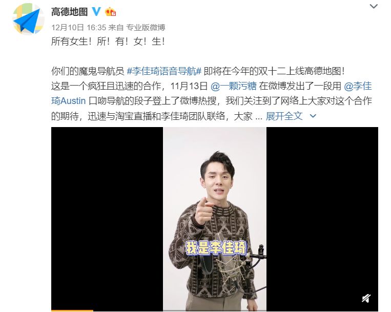 12月10日,高德地图微博发文,宣布李佳琦导航语音将于12月12日正式上线。上线后,李佳琦导航语音在高德地图手机版App和车机版均可使用。用户在高德地图搜索“李佳琦”即可查看语音包下载信息,还可领取打车现金福利。此前,高德地图已上线了林志玲、岳云鹏、郭德纲、周星星、马丽、罗永浩、高晓松、黄晓明、黄健翔、倪妮、《魔兽世界》等导航语音,还提供了邓伦、宋茜、吴谨言、陈立农【轻春版】的语音包。