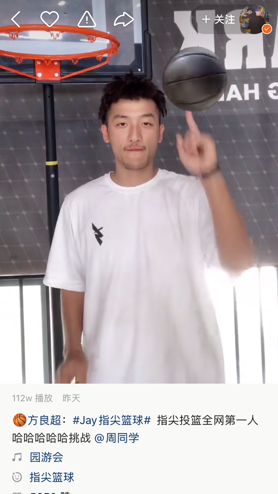 快手主页认证为“中国著名街球手”的方良超在篮球架前表演了“指尖投篮”,这一作品的背景音乐是周杰伦2004年的作品《园游会》。