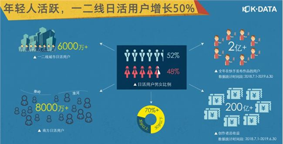 除此之外,报告还显示“北方”“三四线”“大龄”等各类标签都不再适用于快手,彼时的快手一二线城市日活用户超过 6000 万,增长达50%,男女用户比例接近平衡,30 岁以下占比达70%以上。