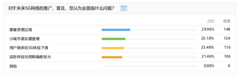 而排在第二位的问题就是网络覆盖,由于5G的单个基站覆盖范围小,需要布置更多的基站,从而要耗费大量的人力物力,所以目前还只是一线城市覆盖率比较高,但还是有室内覆盖比较少,很多地方5G网络并不快等等的问题,这些需要运营商进一步的建设5G。