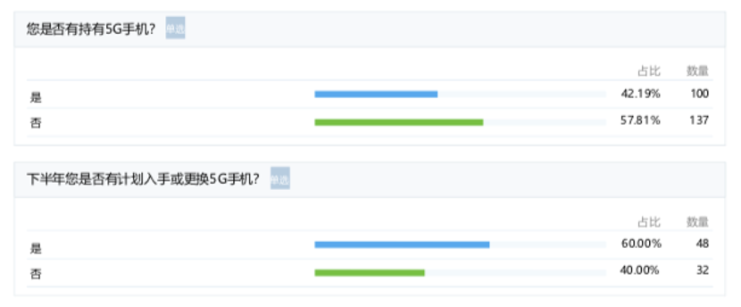 随着5G的不断普及,5G手机也成了目前大家比较关心和关注的话题。在调查问卷的受访者中,年龄主要集中在30岁以下的年轻人,这些受访者中已经有42%的用户购买了5G手机,而没有5G手机的用户中也有6成的朋友有计划下半年更换5G的手机。可见大多数年轻人对于5G手机是比较关注,而且也对于5G手机有着强烈的购买欲望。