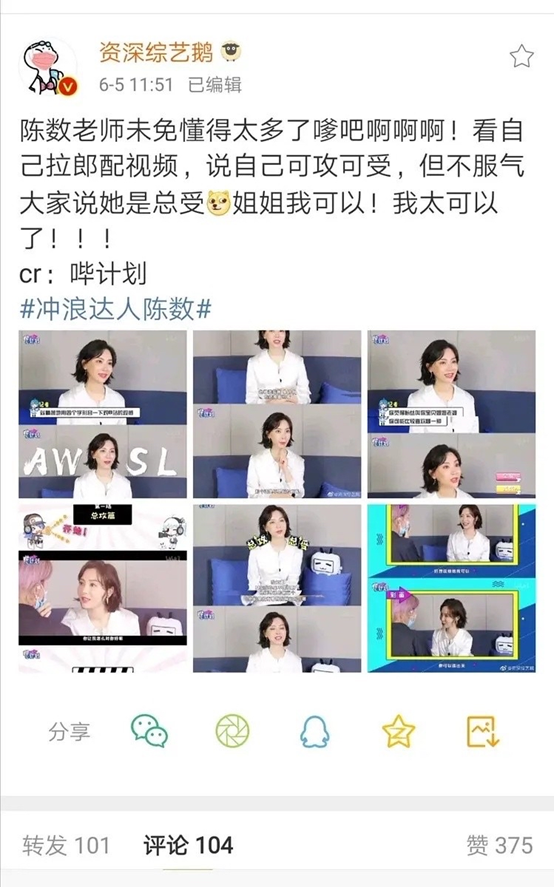 无独有偶,陈数同样在采访中说自己会看拉郎配视频,称自己“可攻可受”。
