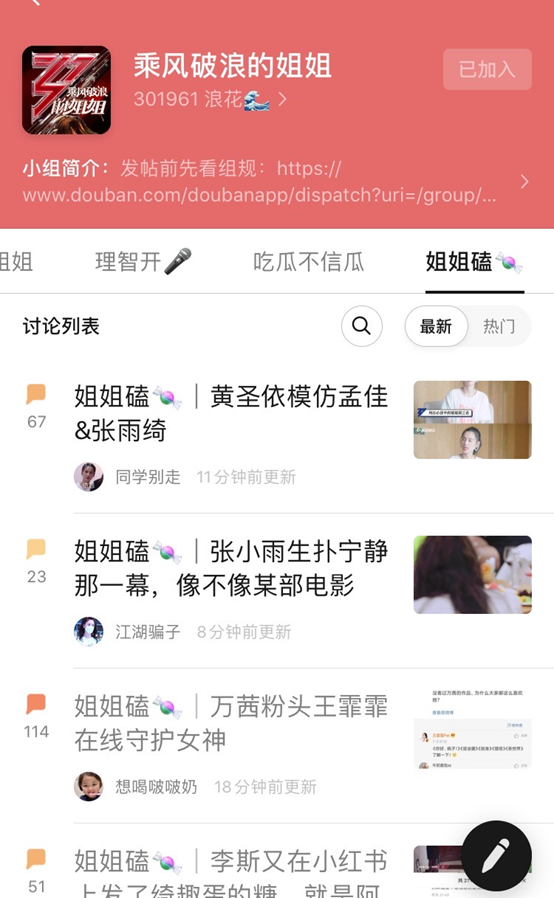 打开《乘风破浪的姐姐》豆瓣小组,可以发现小组专门开辟出了一个叫“姐姐磕糖”的栏目,用来供组员嗑CP。
