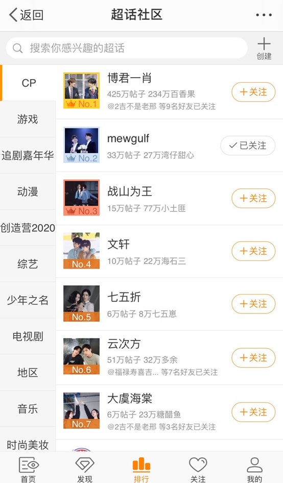 在微博超话社区“CP”这一分类里,王一博和肖战的CP“博君一肖”排名第一。“七五折(SNH48成员徐佳琪和吴哲晗的CP名称)”排名第七,在超话女女CP里位列第一,但其6万的发帖数量远远比不过“博君一肖”的425万。
