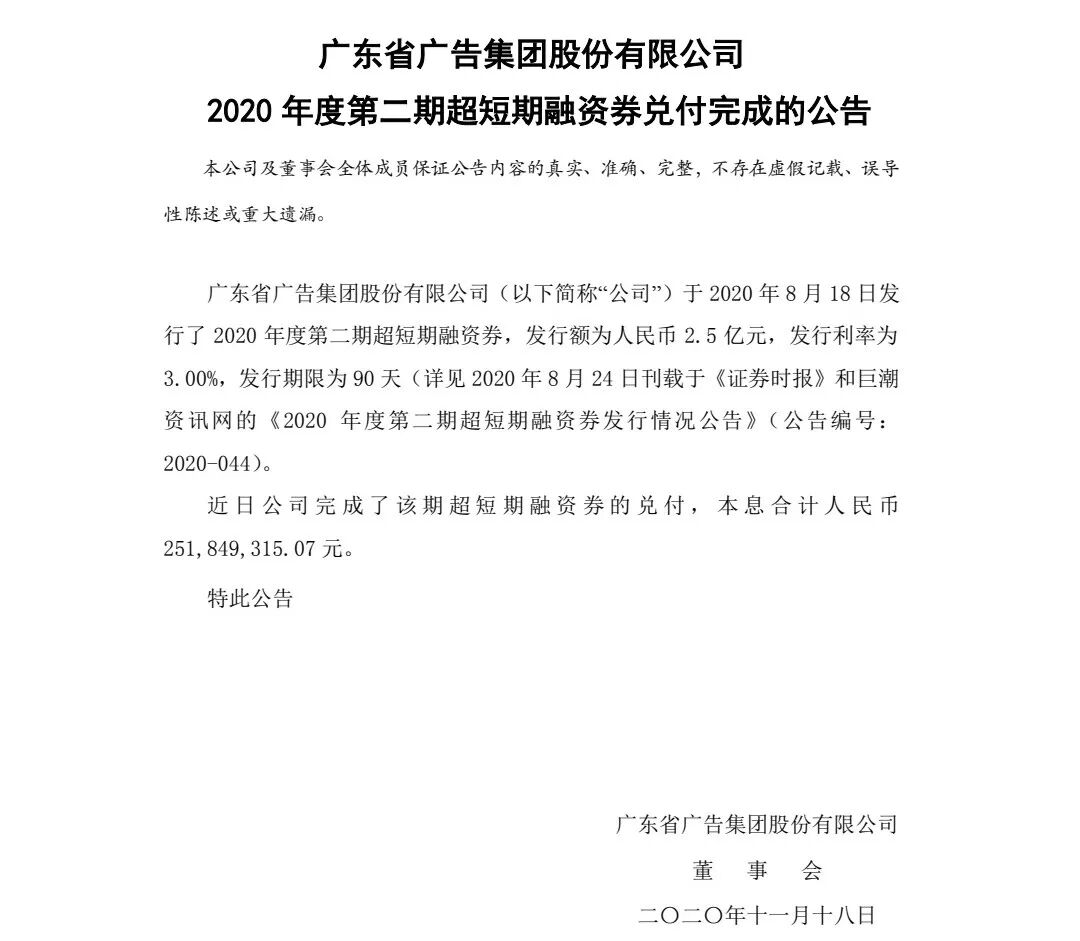 11 月 17日,省广集团发布公告,称广东省广告集团股份有限公司于2020年8月18日发 行了2020年度第二期超短期融资券,发行额为人民币2.5亿元,发行利率为3.00%,发行期限为90天。近日公司完成了该期超短期融资券的兑付,本息合计人民币251,849,315.07元。