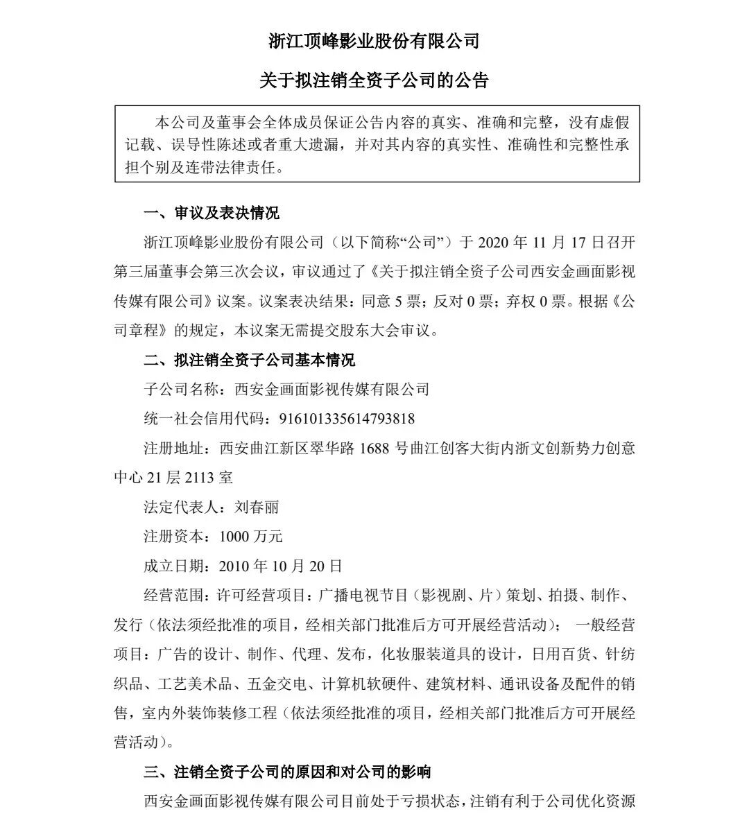11月17日,顶峰影业发布关于拟注销全资子公司的公告。公告显示,浙江顶峰影业股份有限公司第三届董事会第三次会议,审议通过了《关于拟注销全资子公司西安金画面影视传媒有限公司》议案。公司拟注销全资子公司西安金画面影视传媒有限公司。西安金画面影视传媒有限公司法定代表人为刘春丽,注册资本为1000万元,成立日期为2010年10月,经营范围包括广播电视节目(影视剧、片)策划、拍摄、制作、发行等。