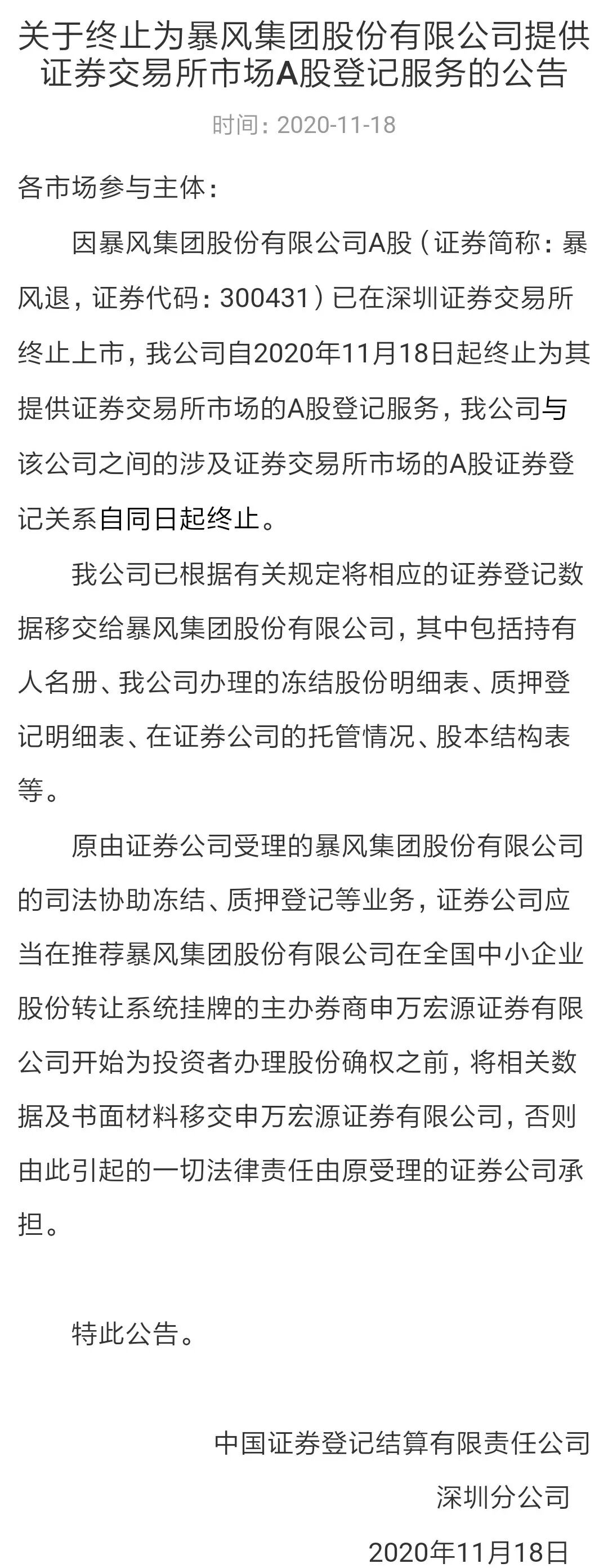11月18日,深交所发表公告称,因暴风集团股份有限公司A股(证券简称:暴风退,证券代码:300431)已在深圳证券交易所终止上市,深交所自2020年11月18日起终止为其提供证券交易所市场的A股登记服务,深交所与该公司之间的涉及证券交易所市场的A股证券登记关系自同日起终止。