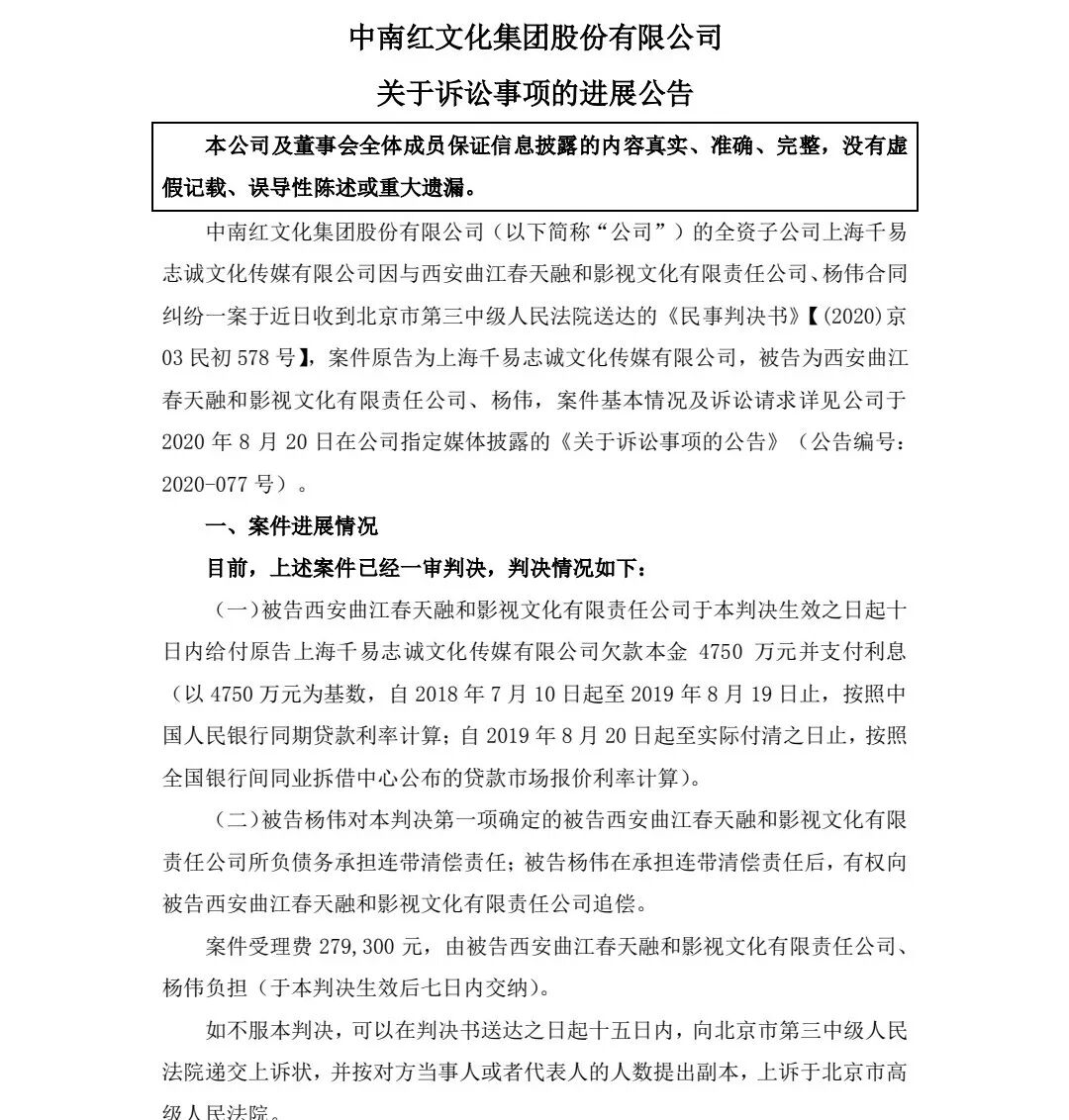 11月18日,*ST中南发布关于诉讼事项的进展公告。公告显示,中南红文化集团股份有限公司的全资子公司上海千易志诚文化传媒有限公司因与西安曲江春天融和影视文化有限责任公司、杨伟合同纠纷一案于近日收到北京市第三中级人民法院送达的《民事判决书》,案件原告为上海千易志诚文化传媒有限公司,被告为西安曲江春天融和影视文化有限责任公司、杨伟。目前,上述案件已经一审判决,判决情况如下,被告西安曲江春天融和影视文化有限责任公司于本判决生效之日起十日内给付原告上海千易志诚文化传媒有限公司欠款本金4750万元并支付利息;被告杨伟对本判决第一项确定的被告西安曲江春天融和影视文化有限责任公司所负债务承担连带清偿责任;被告杨伟在承担连带清偿责任后,有权向被告西安曲江春天融和影视文化有限责任公司追偿。
