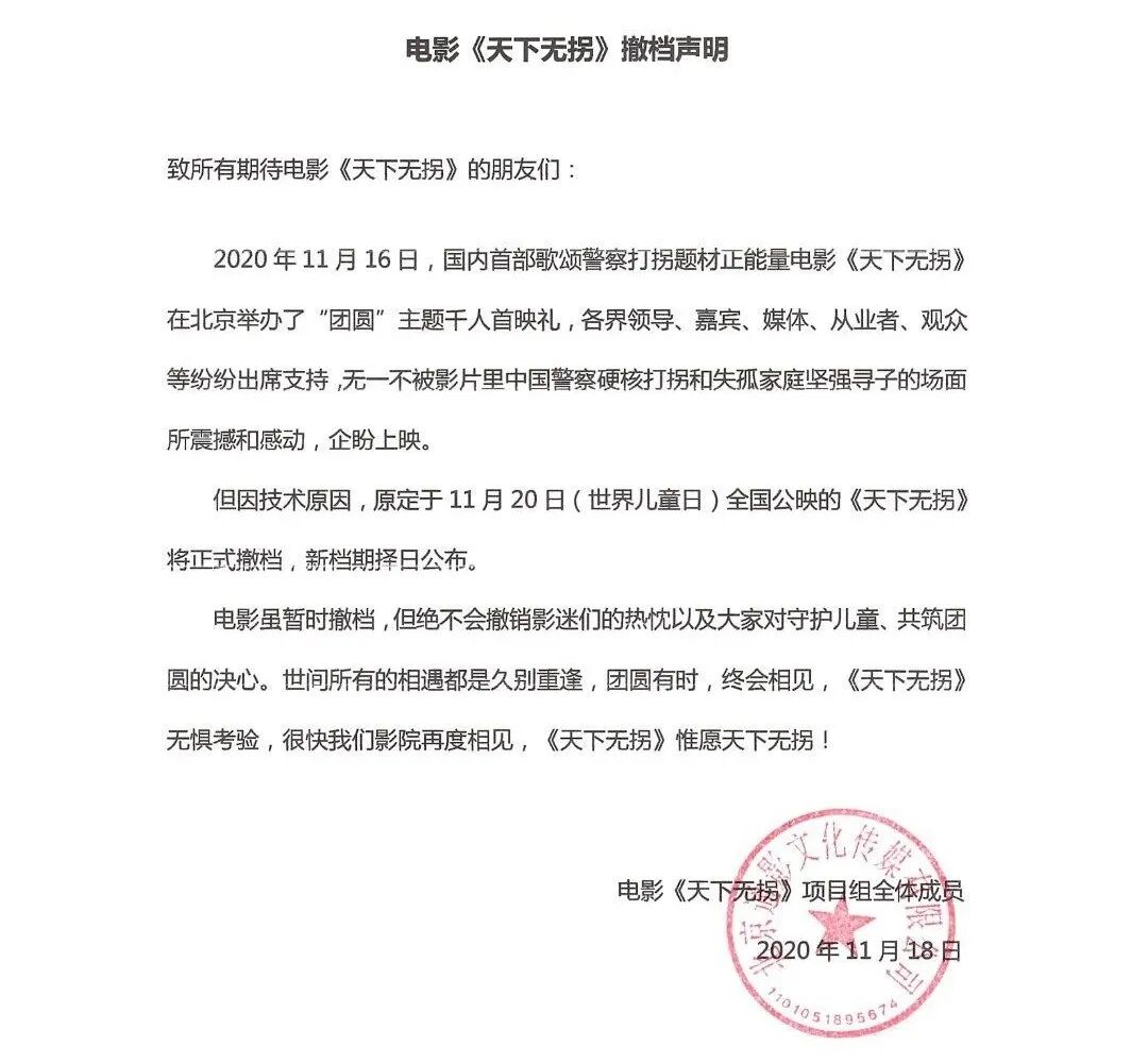 11月18日,电影天下无拐发表声明,称因技术原因,原定于11月20日(世界儿童日)全国公映的电影天下无拐将正式撤档,新档期择日公布。