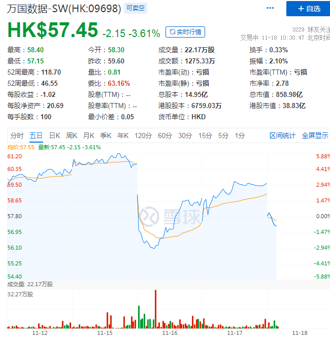 财报公布后次日,万国数据股价呈拉升之势,不过,这种股价的反弹趋势并没有持续,截至发稿,股价跌幅3.61%,报57.45港元。