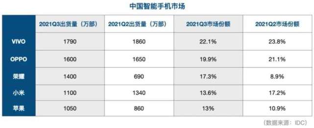 IDC数据显示,国内市场上,三季度荣耀出货量较第二季度翻了一倍,市场份额由8.9%提升至17.3%。小米出货量则环比减少21.8%,市场份额由17.2%萎缩至13.6%。VIVO和OPPO在中国市场的出货量和市场份额也有所降低,但降幅均不及小米。