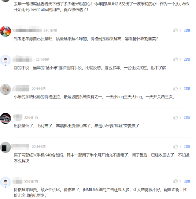 在某财经社区与小米有关的文章下面,网友们评论认为小米“质量越来越不咋的,价格倒是越来越高”、“小米的系统比他的价格还拉,最垃圾的系统没有之一”、“MIUI系统的广告还是太多,让人感觉很不好”……