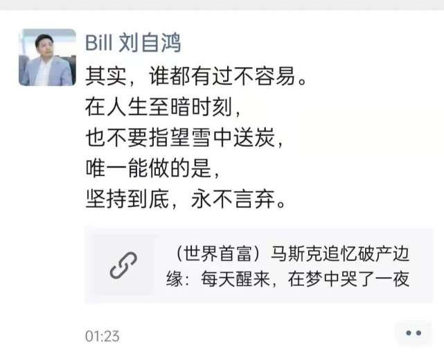 12月9日凌晨,柔宇科技董事长刘自鸿在个人社交媒体上转发了《马斯克追忆破产边缘:每天醒来,在梦中哭了一夜》的文章。并配文:其实,谁都有过不容易。在人生至暗时刻,也不要指望雪中送炭,唯一能做的是,坚持到底,永不言弃。
