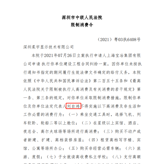 限制消费令显示,法院于2021年7月26日立案执行申请人上海宝冶集团申请执行建设工程合同纠纷一案,因柔宇显示未按执行通知书指定的期间履行生效法律文书确定的给付义务,法院对柔宇显示采取限制消费措施,限制公司及法定代表人刘自鸿不得实施乘坐飞机、高铁等高消费及非生活和工作必需的消费行为。