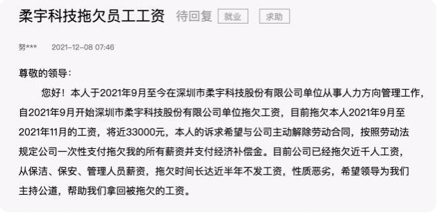 12月8日,有网友在人民网领导留言板留言称,其本人在柔宇科技从事人力方向管理工作,公司目前已拖欠9到11月三个月的工资。同时该网友透露,目前公司已经拖欠近千人工资,从保洁、保安、管理人员薪资,拖欠时间将近半年。
